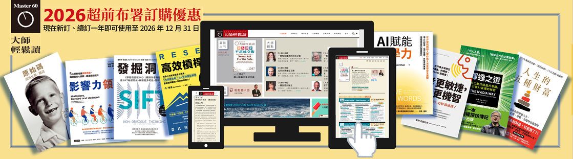 《大師輕鬆讀》是個現代「書僮」,他幫你選書,精選新的知識,做重點摘要的整理,並提供線上、數位及紙本不同載具上可能的服務。