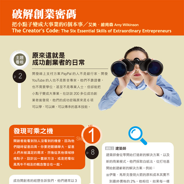 >精采內容< 把小點子變成大事業的6個本事 跟著成功開創家這樣做 人們總是想跟成功者學習成功的祕訣,但是無論你怎麼打探、窺看,終將發現這些創業者的成功歷程,其實與常人無異。但是他們會重新定義問題,從新的角度實現新的點子。
