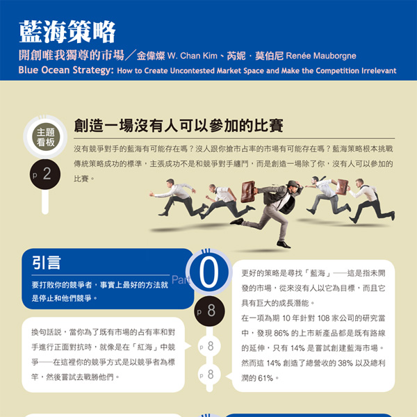 >精采內容< 大市場不一定大獲利 走出你自己的一片藍海 公司規畫策略時,開頭總是先描述當前產業狀況和競爭環境,接著分析如何提高市場占有率。換句話說,就是以紅海為導向。若要駛向藍海,你必須從策略的開發到執行,採用完全不同於紅海的原則。