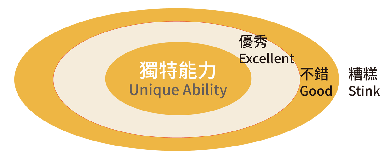 「UA(獨特能力)圈的設計是像洋蔥那樣可以層層剝去。每周、每月、每年,一次剝掉一層;剝掉的外層都是你不該去做的事。最後你會剝到洋蔥的核心,這代表著你應該要做的事。這個練習可以讓你每天有更多時間、工作時間減少卻賺更多錢,並且讓你專注在真正該做的事情上。」