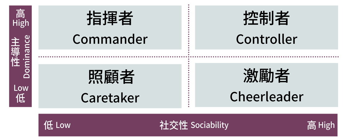影響人們在職場互動的兩大關鍵維度是:(1) 主導性(對決策和行動的掌控程度)以及 (2) 社交性(對人際關係和情感的重視程度)。這兩個維度衍生出4種類型的人格: