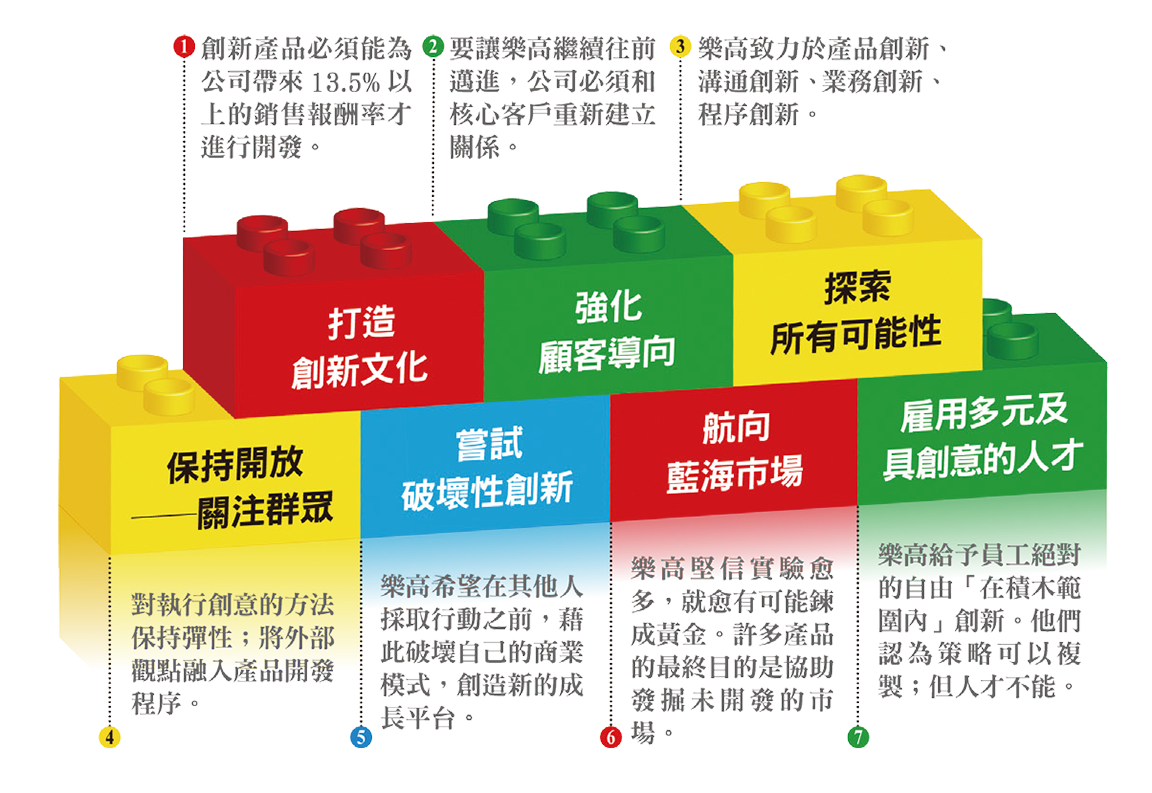 2003 年,甫獲《財富》雜誌封為「世紀玩具」短短 3 年之後,樂高公布公司史上最大虧損,而且瀕臨破產邊緣。但就在 2007 至 2011 年全球景氣衰退之際,它的稅前獲利卻成長 4 倍。究其原因,樂高做錯、做對的正是企業界廣泛使用的 7 項創新原則。