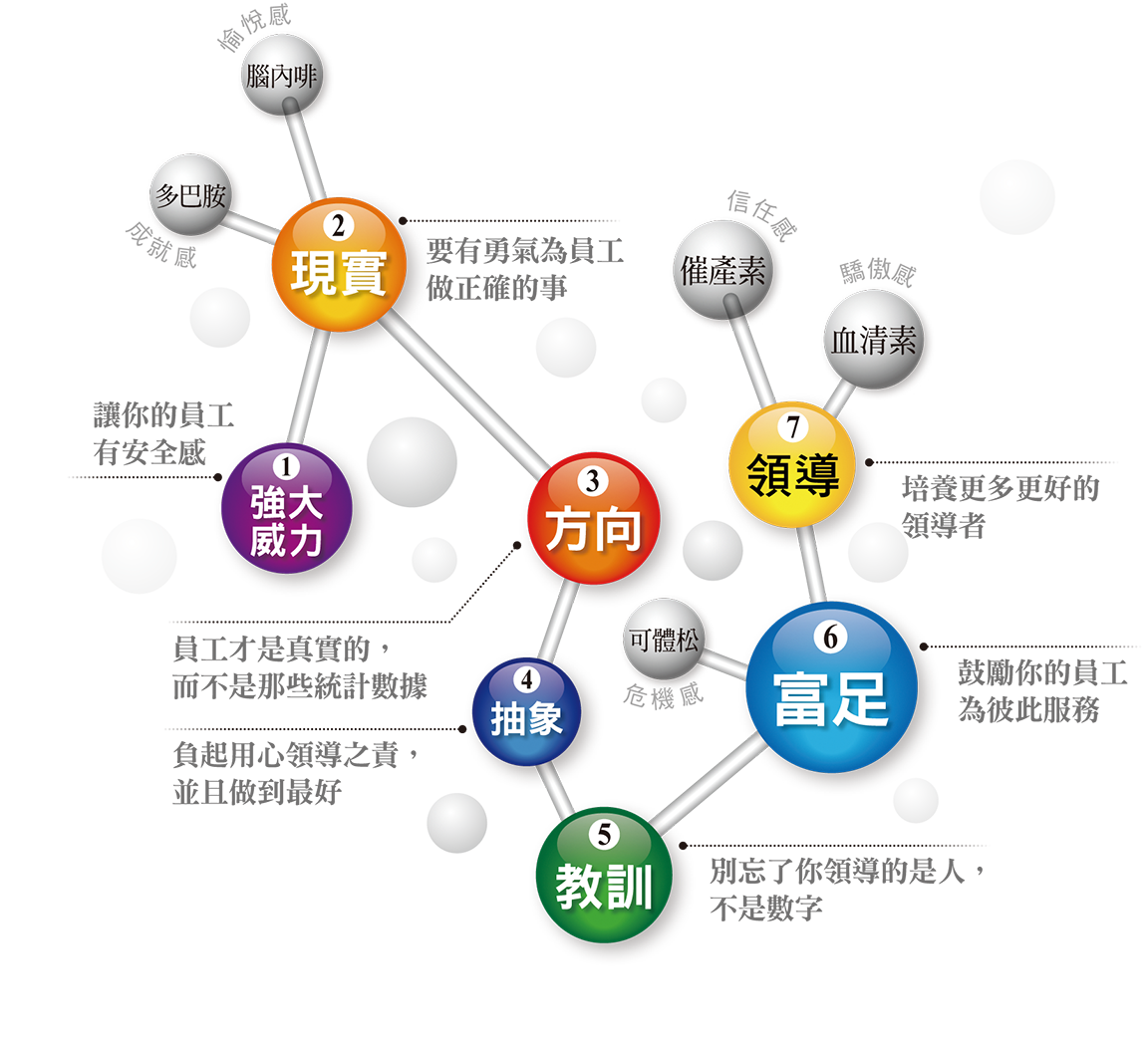 封面概念:仿分子結構呈現領導涉及的 7 個重要元素,結合 5 個人體自然產生的化學物質,暗喻卓越領導者應該創造一種環境,讓正確的化學物質基於適當的理由釋放出來。最終產生一群非常能自我激勵的員工,不再需要外部機制加以激勵。