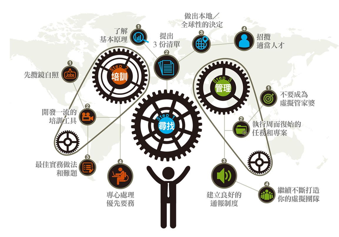 尋找和雇用虛擬員工與找人進辦工室工作的過程沒有什麼不同。主要差別往往在於你要抱持成功做好這件事的心態。此時要牢記以下 4 個重點: 1. 了解基本原理。 2. 提出 3 份清單。 3. 做出本地/全球性的決定。 4. 招攬適當人才。