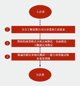 企業都是先以一種事業計畫(A計畫)起步,結果卻靠著完全不同的做法獲得成功(運用了B計畫或C計畫)。有鑑於此,不要等到已經瀕臨破產才想到要擬定B計畫,要縮短摸索的過程。事實上,早在下筆撰寫事業計畫之前,就應該先針對預設商業模式中的5項關鍵要素進行壓力測試,把這些要素規畫妥當。這樣才有辦法寫出真正可行的事業計畫(接近B計畫的計畫),而不是看起來很有發展潛力、卻沒有任何事實根據的計畫(即A計畫)。