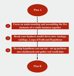 Lots of companies start with one business plan in mind (their Plan A) but end up being successful doing something entirely different (applying a Plan B or a Plan C). With this in mind, don't wait until you're almost broke to get around to developing your Plan B. Speed up the process of discovery. In fact, even before you put pen to paper to write your business plan, stress test the five key components of your proposed business model and get them right first. Then you can write a business plan that works (a Plan B style plan) rather than something that looks promising but has no basis in reality (a Plan A).