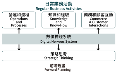 數位神經系統是一個鏈結,連結策略思考(前瞻規畫的基礎)與日常持續營運活動的3大要素:
