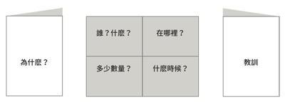 拿一張A4紙,先左右對折,再上下對折。展開後,背面當作封面和封底,正面當作內頁,有4個空格。利用這6個空間,快速識別、驗證和預先設想你想要分享給聽眾的關鍵元素。